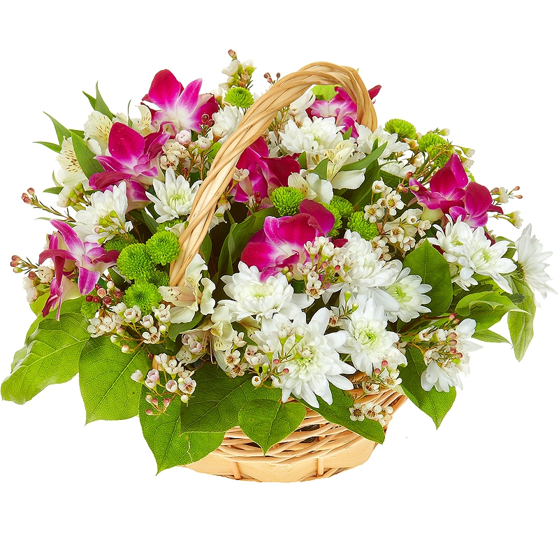 Букет состоит из 7 орхидей, 4 ветки кустовой хризантемы, 4 ветки хризантемы Сантини, 3 альстромерии, 3 ветки ваксфлауэра, зелень, корзина, оазис.