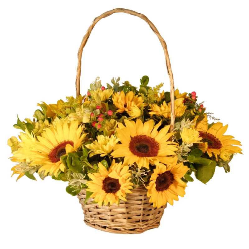 Букет состоит из 15 подсолнухов, 3 ветки альстромерии, 5 хризантем, 2 ветки солидаго, 3 гиперикума, зелень, корзина, оазис.