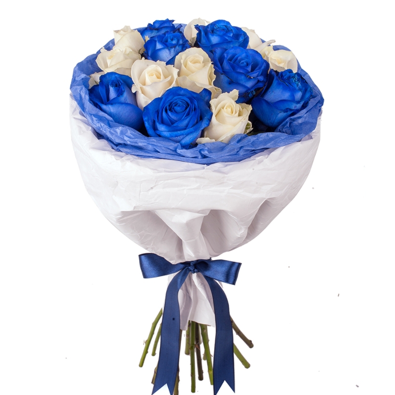 Букет состоит из 8 белых роз, 7 синих роз, красивая упаковка, атласная лента.