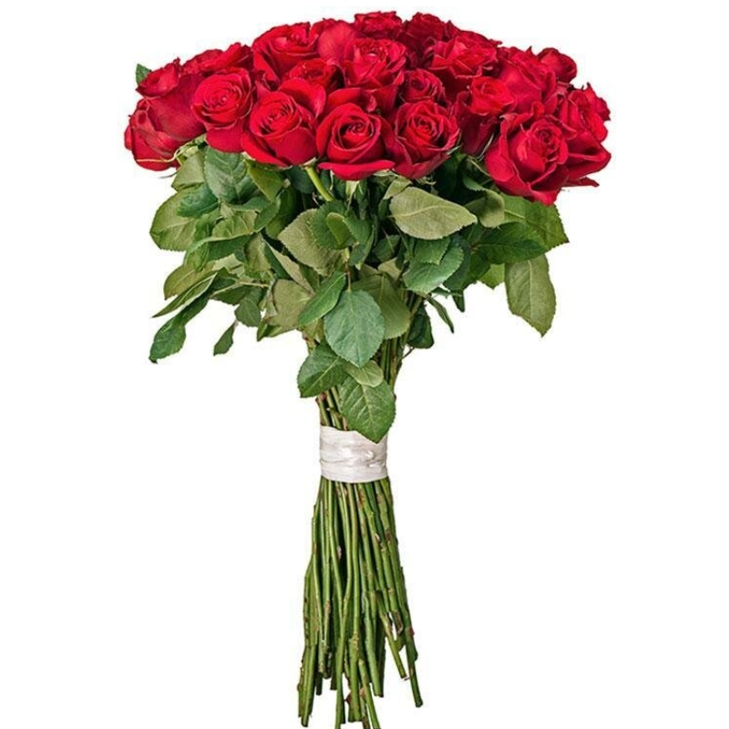 Букет состоит из 31 красная роза, прозрачная упаковка, красная лента.