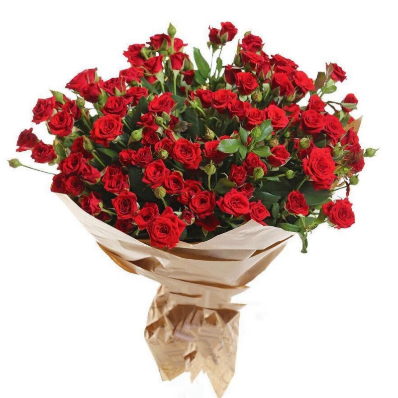Букет состоит из 15 красных кустовых роз, крафт, атласная лента.